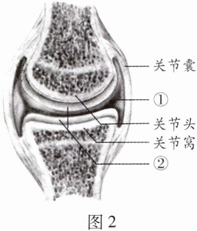 (3)鸡翅去除肌肉后,观察骨与骨的连接。剖开一个较大的关节,观察关节的结构,如图2所示,填写关节结构的名称:①