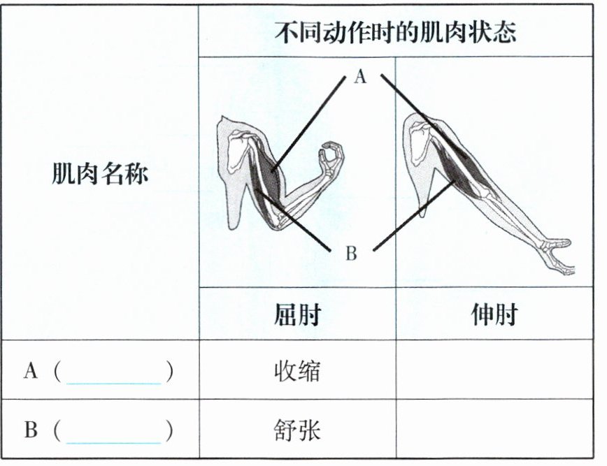 (二)1. A(肱二头肌) 舒张 B(肱三头肌) 收缩 (1)收缩 关节 运动 (2)多 2. 神经系统 消化系统 呼吸系统 循环系统