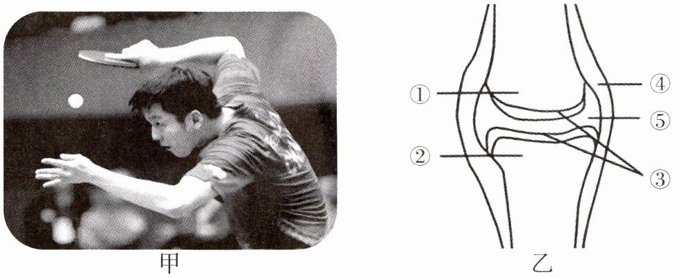 8. 在中国,乒乓球运动十分普及,乒乓球被称为“国球”,图甲是乒乓球运动员在比赛过程的瞬间,图乙是关节的示意图,请回答下列问题。(在[