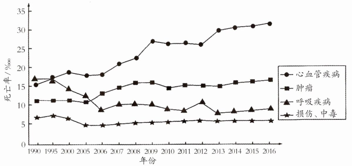 6. 下图为中国农村居民主要疾病死亡率变化曲线图。下列有关叙述
