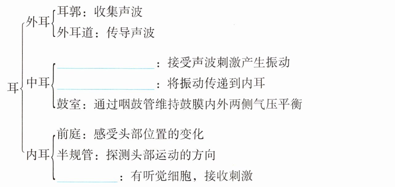 3. 耳的各部分结构受损都有可能导致听力受损。(合理即可)