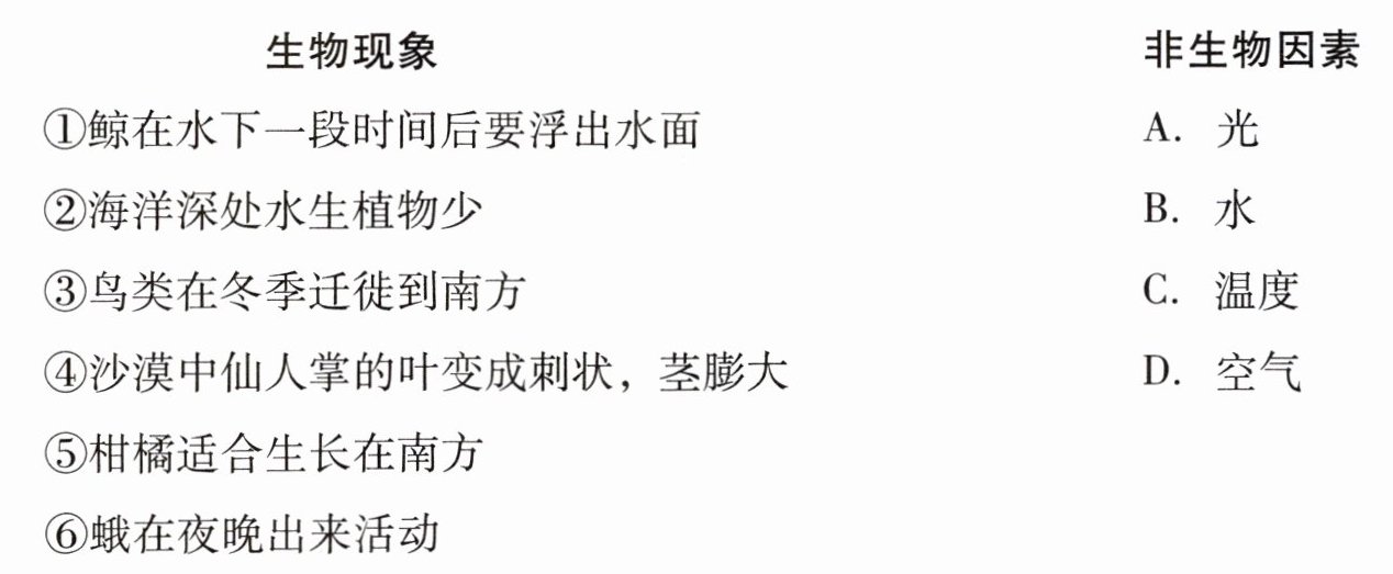6. 将下列生物现象及其主要受到的非生物因素进行对应连线。
