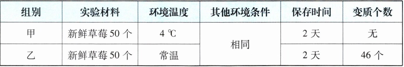 7. 草莓成熟时节,气温逐渐升高,买回来的新鲜草莓很容易腐烂变质。为了探究新鲜草莓在低温下能否延长保鲜时间,某学校生物兴趣小组的同学们在草莓园里采摘了同一品种、大小相近的新鲜成熟草莓,并设计了以下实验方案: