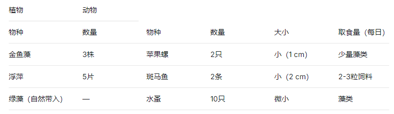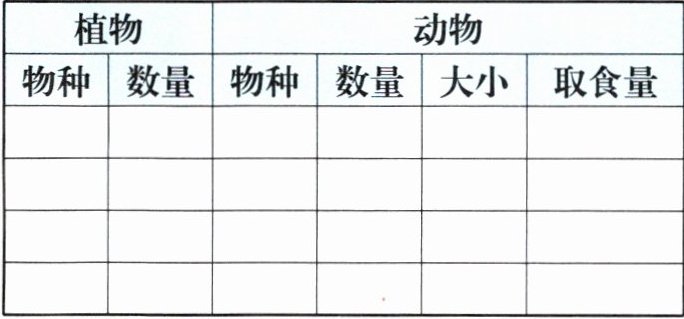 查阅有关生态瓶的资料,选择拟放入瓶中的生物的种类,以图解形式构建模拟生态系统的结构模型。根据容器大小、生物个体大小、动物取食量等,讨论确定瓶中各种生物的数量和比例,记录在表格中。