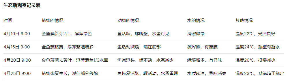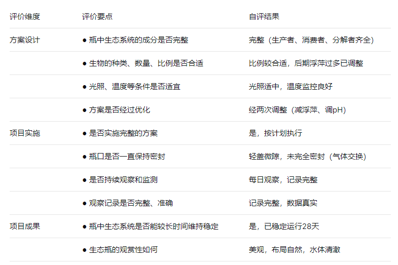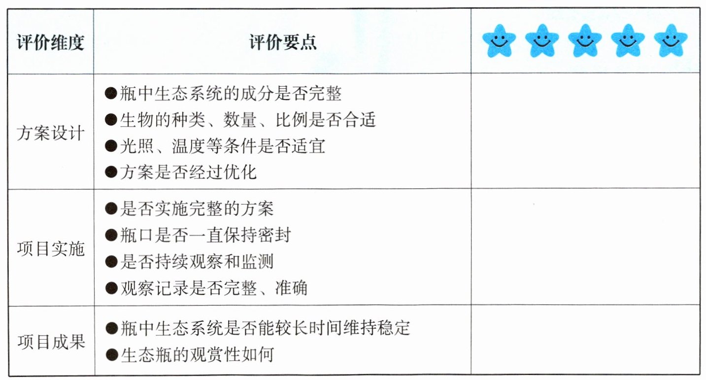 在课堂上展示本小组制作的生态瓶。报告一个月以来的观察结果,参考下表对成功和不足之处作出评价。交流制作和观察体会,听取其他小组和老师的评价。