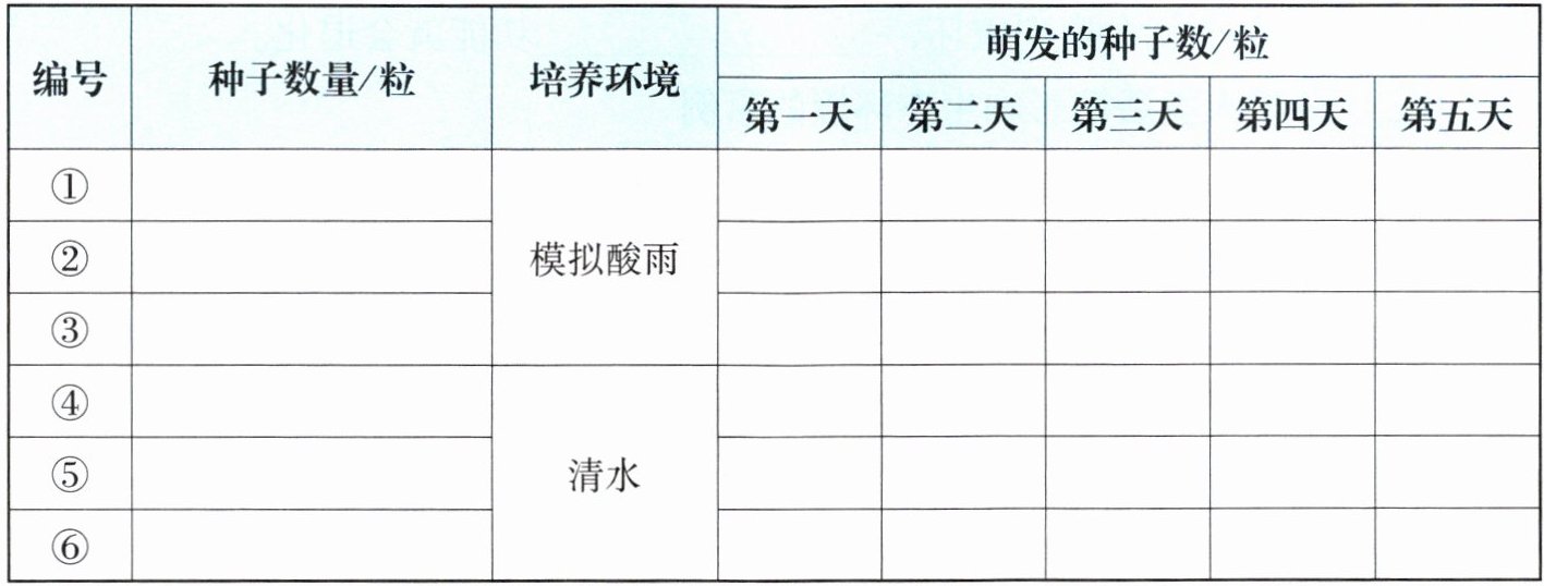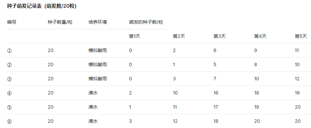 4. 每天向培养皿添加等量的模拟酸雨溶液或清水,并观察和记录种子的萌发情况。