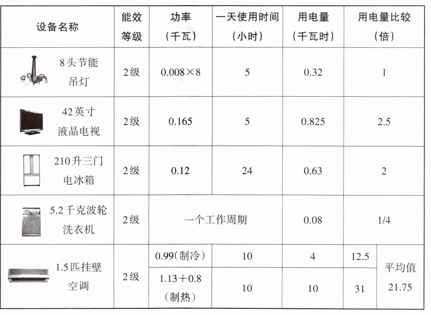 2. 吊灯和电视用电量按照功率乘以时间计算;冰箱和洗衣机用电量采用产品能效标识注明的数值,它是在实验室标准使用情况下测出的数据;空调用电量与天气变化、用户设置的室内温度高低、房间的大小和房间保温情况等多种因素有关,表中数据为特定场所的实侧用电量。