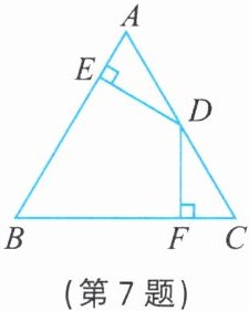 7. 已知:如图,在$\triangle ABC$中,$AB = AC$,$D$ 为 $AC$ 的中点,$DE \perp AB$,$DF \perp BC$,垂足分别为 $E$,$F$,且 $DE = DF$。求证:$\triangle ABC$ 是等边三角形。