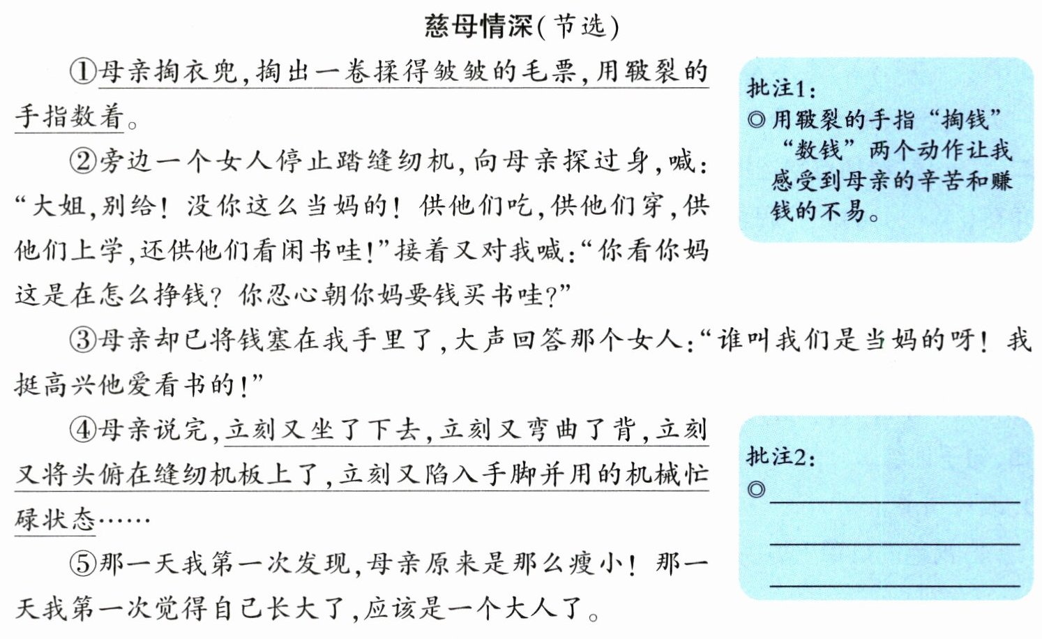1. ①母亲塞钱给“我” ②母亲又陷入忙碌状态 2. 用四个“立刻”写出了母亲挣钱的艰辛和工作的繁忙。 3. D