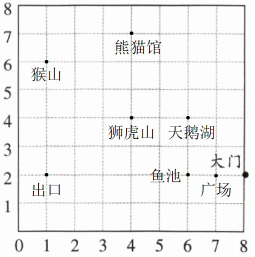 (1)星期天,小华与她的同学从广场$(7,2)$出发,经过鱼池、天鹅湖$(6,4)$、狮虎山、熊猫馆$(4,7)$、猴山$(1,6)$后从出口出来。请在图上标出广场、天鹅湖、熊猫馆和猴山的位置。