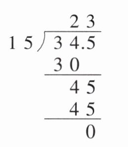 $\begin{array}{r r r r r r r r r }&&&2&.&3 \\ \hline &1&5&)&3&4&.&5 \\ &&&3&0 \\ \hline &&&&4&.&5 \\ &&&&4&.&5 \\ \hline &&&&&0\end{array}$
