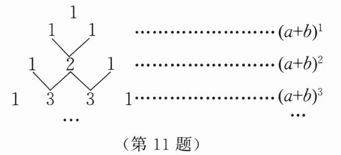 11. 【数学文化】我国古代数学的许多发现都曾位居世界前列,其中“杨辉三角”就是一个。如图,这个三角形的构造法则是:两腰上的数都是 1,其余每个数均为其上方左右两数之和,它给出了 $(a+b)^{n}$($n$ 为正整数)的展开式(按 $a$ 的次数由大到小的顺序排列)中各项的系数规律。例如,在三角形中第三行的三个数 1,2,1,恰好对应着 $(a+b)^{2}$ 的展开式中各项的系数;第四行的四个数 1,3,3,1,恰好对应着 $(a+b)^{3}$ 的展开式中各项的系数。