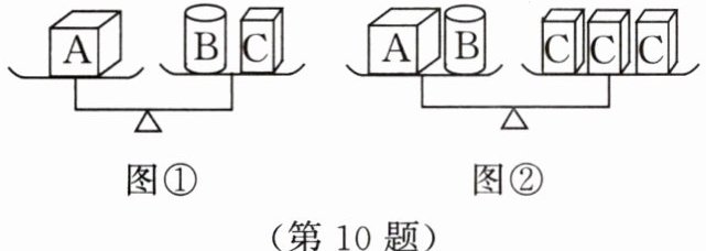 10. 如图,在图①所示的天平上,物体$A的质量等于物体B的质量加物体C$的质量;在图②所示的天平上,物体$A的质量加物体B的质量等于3个物体C$的质量。由此可知,$1个物体A$的质量与( )个物体$C$的质量相等。