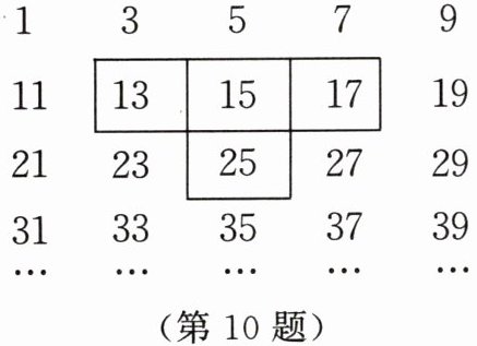10. 【数学游戏】将连续的奇数 $1$,$3$,$5$,$7$,$9$,…按一定规律排成如图所示的数表,图中的 $T$ 形框框住了四个数,若将 $T$ 形框上下左右移动,按同样的方式框住的四个数的和为 $182$,求 $T$ 形框内处于中间且靠上的数。