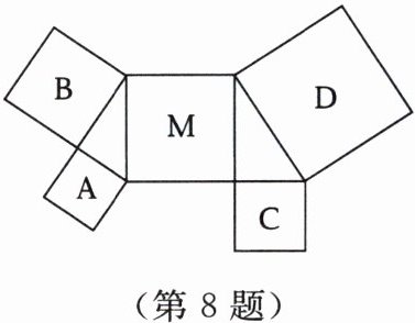 8. 如图,四边形$A$,$B$,$C$,$D$,$M$都是正方形,由正方形的边围成的两个三角形都是直角三角形,正方形$A$,$B$,$C的面积分别是2$,$4$,$3$,则正方形$D$的面积是
