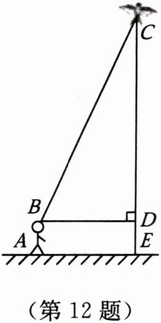 12. 【数学应用】如图,身高为$1.6\ m$的小明($AB$)想利用“勾股定理”计算出风筝的高度$CE$,已知他测得$BD的长度为25\ m$,并根据手中剩余线的长度计算出风筝线$BC的长为65\ m$。求风筝的高度$CE$。