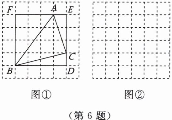 操作发现:如图,在$6×6$的正方形网格中,每个小正方形的边长均为$1$,在图①中画出$\triangle ABC$,同时构造正方形$BDEF$,且它的边$DE$,$EF分别经过点C$,$A$,借助此图便可求出$\triangle ABC$的面积。
