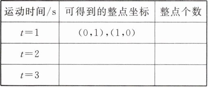 (1)运动时间/s 可得到的整点坐标 整点个数 t=1 (0,1),(1,0) 2 t=2 (0,2),(2,0),(1,1) 3 t=3 (0,3),(3,0),(2,1),(1,2) 4