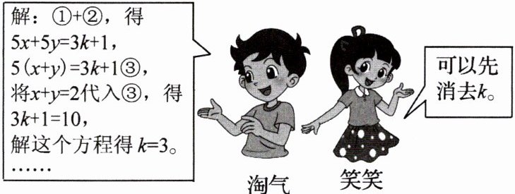 12. 如图,淘气、笑笑两位同学在学习过程中遇到这样一个问题:二元一次方程组$\begin{cases}2x + 3y = 2k + 3①\\3x + 2y = k - 2②\end{cases} 的解满足x + y = 2$,求$x$,$y$,$k$的值。