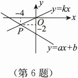6. 如图,已知函数 $ y = ax + b $ 和 $ y = kx $ 的图象交于点 $ P $,则根据图象,可得关于 $ x $,$ y $ 的二元一次方程组 $ \begin{cases} y = ax + b, \\ y = kx \end{cases} $ 的解是