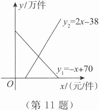 11. 【数学应用】如图,某地区对某种药品的需求量$y_{1}$(万件)、供应量$y_{2}$(万件)与价格$x$(元/件)分别近似满足下列关系式:$y_{1} = - x + 70,y_{2} = 2x - 38$。当需求量为$0$时,即停止供应。当$y_{1} = y_{2}$时,该药品的价格称为稳定价格,需求量称为稳定需求量。