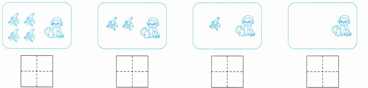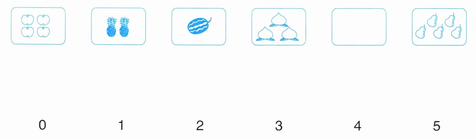 (连线方式:4个苹果-4,2个菠萝-2,1个西瓜-1,3个桃子-3,0个水果-0,5个梨-5)