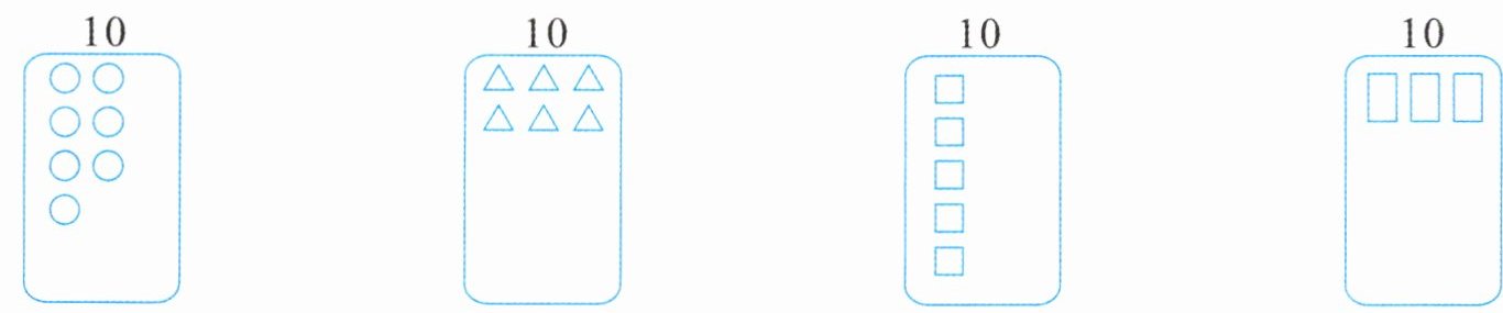 本题可先分析每个图形中已有的图形数量,再结合总数$10$计算出缺少的图形数量,最后画出缺少的图形。