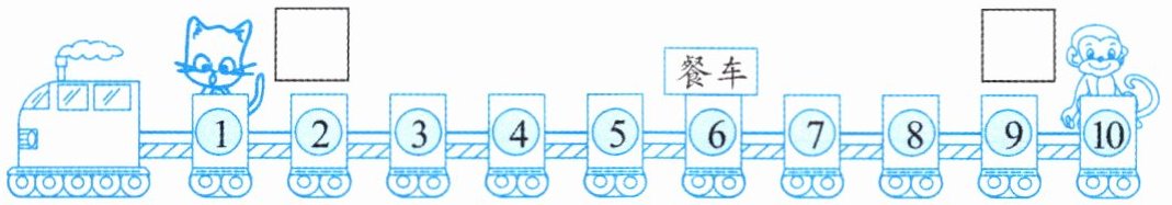 解:小猫在1号车厢,餐车在6号车厢,它们之间间隔$6 - 1 = 5$个车厢。