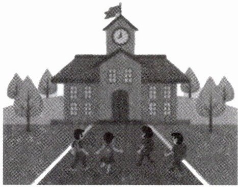 小朋友4人,树5棵,教学楼1栋,钟1个,红旗1面。