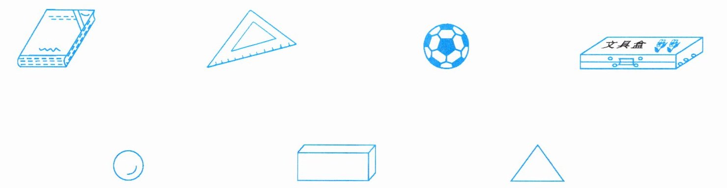 书本连长方体;三角板连三角形;足球连球体;文具盒连长方体(从左到右依次连)。