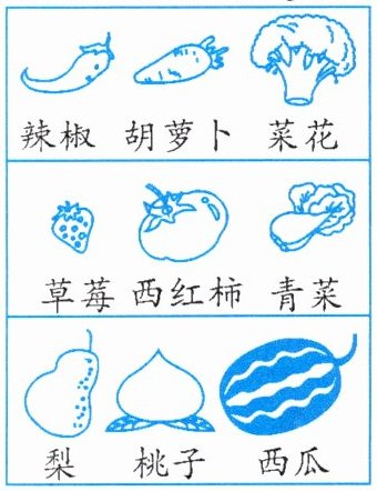 2. 下图是乐乐家冰箱保鲜室,找一找,在括号里填上相应物品的名称。