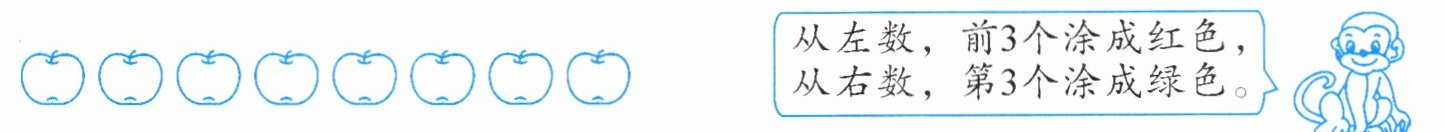 从左数第1、2、3个苹果涂红色;从右数第3个苹果涂绿色(即从左数第6个苹果)。