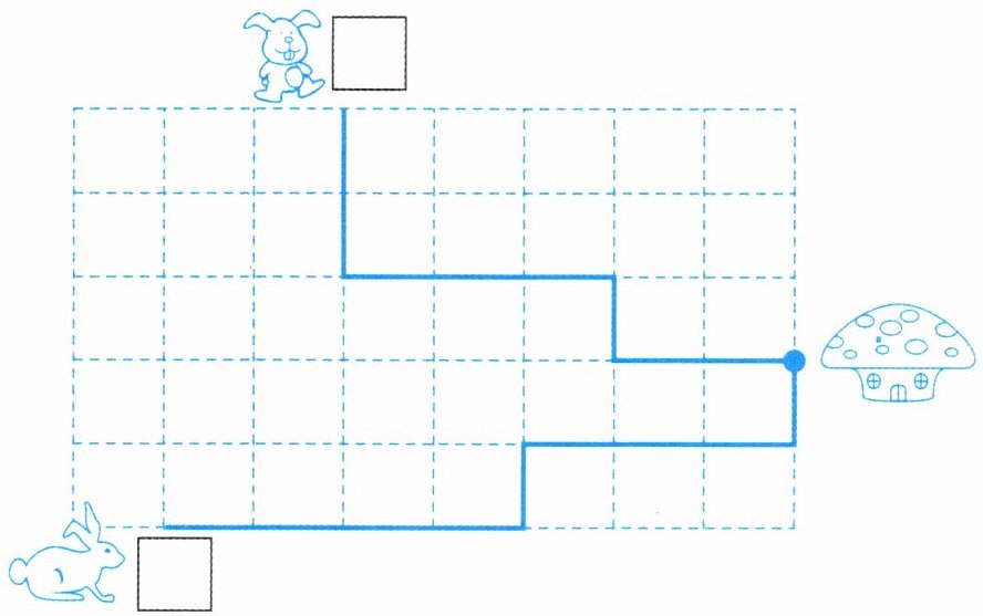 解:通过数格子边的数量来比较距离,上面小兔回家的路线占的格子边数量少,所以上面小兔离家近,应在上面小兔对应的方框画“√”。