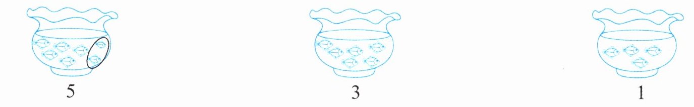 (由于实际为图形操作题,此处用文字描述:圈出数字3对应鱼缸中第4条和第5条小鱼;圈出数字1对应鱼缸中第2条和第3条等超出的小鱼,按题目示例方式圈除多余数量)。