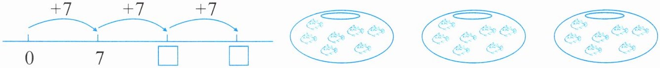 列式为:$7+7 = 14$,$14 + 7=21$(或$7×3 = 21$)。