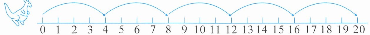 (1) 小袋鼠每次跳$4$格,跳了$5$次,一共有$20$格。$5$个$4$相加,列式:$4 + 4 + 4 + 4 + 4 = 20$。