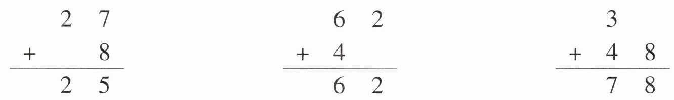 个位上$7+8 = 15$,向十位进$1$,十位上$2 + 0+1=3$($8$没有十位,看作十位是$0$),所以$27 + 8=35$,原计算错误。