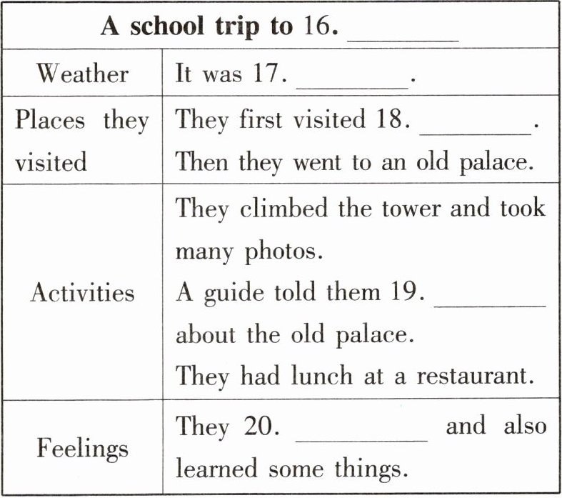 16. an old town 17. sunny and warm 18. an old tower 19. interesting stories 20. had fun