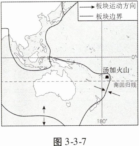(2024·连云港中考)2022年1月,汤加某岛火山剧烈喷发。图3-3-7为该火山位置及所在板块边界示意图,该图完成10、11题。