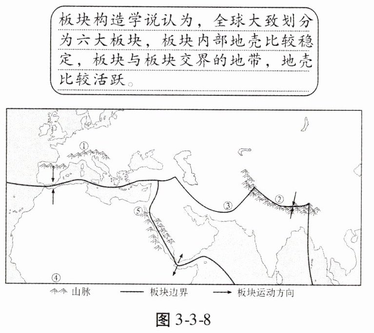 (3) 板块构造学说是在德国科学家魏格纳提出的“____说”的基础上形成的。图中①和②中代表阿尔卑斯山脉的是____,分析②山脉形成的原因。