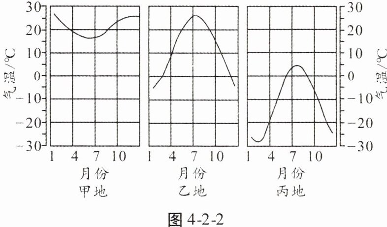 2. 根据同纬度两地的气温高低,判断海陆位置和季节。图4-2-3中,甲处气温低于同纬度的乙处,假如已知甲处是陆地,乙处是海洋,那么陆地气温低于海洋,则此时是冬季;假如已知此时是1月,南半球是夏季,夏季陆地气温高于海洋,那么甲处是海洋,乙处是陆地。