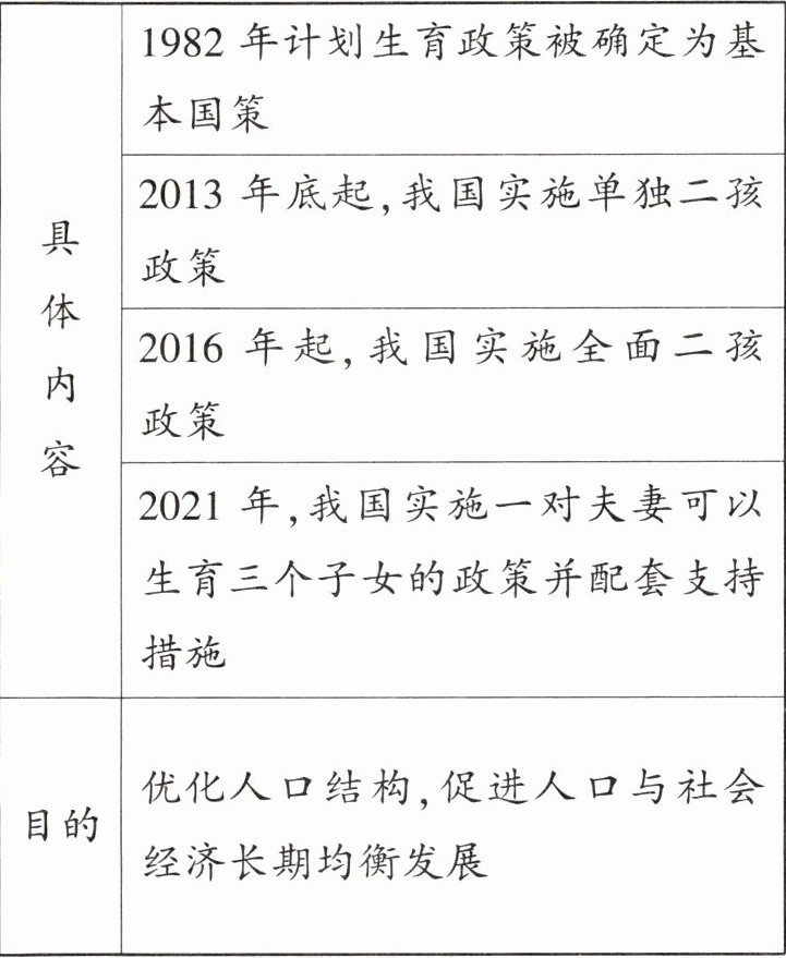 (2)我国人口政策调整的具体内容与目的(表 1 - 2 - 2)。