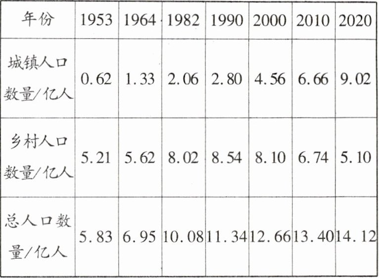 5.A【解析】读表分析可知,我国乡村人口数量先增多再减少,在1990年达到最多,A选项折线图符合题意。6.D【解析】据表中数据分析可知,1953年城镇人口比重小,A错误;人口总数不断增加,B错误;1990年乡村人口数量最多,C错误;城镇人口比例上升,D正确。
