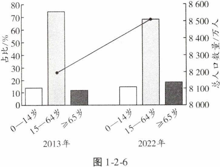 (2024.苏州中考)江苏省位于我国人口密集区,图1−2−6为江苏省2013年和2022 年人口年龄结构和人口总量统计图。据此完