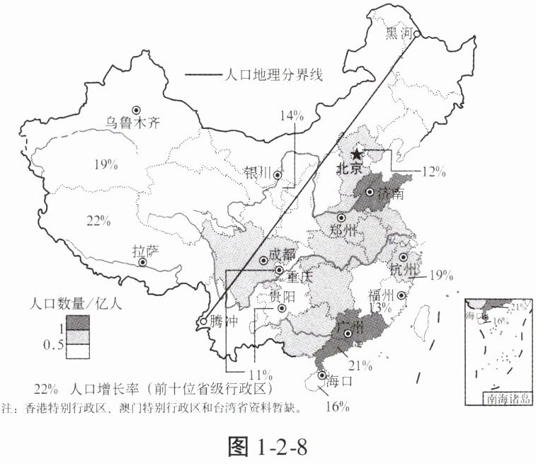 图1−2−8是依据第七次全国人口普查数据绘制的我国各省级行政区人口数量及部分省级行政区人口增长率(2010−2020