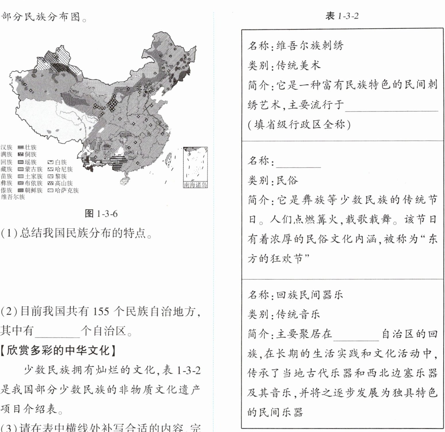 (1)我国民族分布具有“大杂居、小聚居、交错居住”的特点。