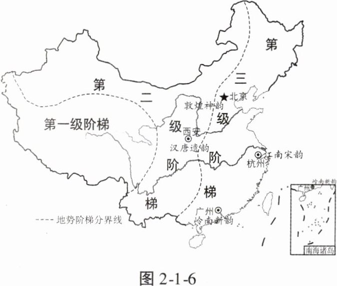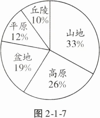 我国有山地、高原、盆地、平原和丘陵五种地形类型,图 2 - 1 - 7 是中国的地形类型图。据此完成 5、6 题。