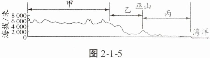 在学习“地形”一节时,贝贝绘制了我国沿 $32^{\circ}N$ 纬线的地形剖面示意图(图 2 - 1 - 5),并与组内同学讨论我国地势特征的影响。据此完成 1、2 题。