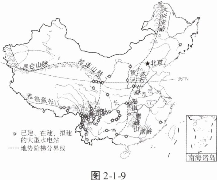 资料三 中国地势三级阶梯及部分大型水电站分布示意图(图 2 - 1 - 9)、中国沿 $36^{\circ}N$ 纬线的地形剖面示意图(图 2 - 1 - 10)。