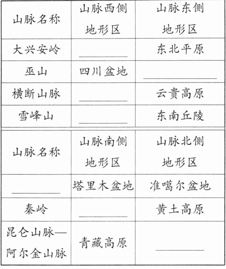 3. 山脉构成的“网格”中分布着我国主要地形区。阅读教科书图 2.4、图 2.5,完成表 2-1-3,了解我国主要地形区与山脉的位置关系。